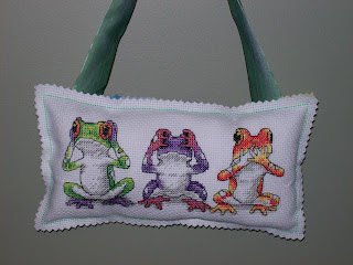 My friend Shelly gave me a gift certificate to Michaels so I rushed right in after Christmas to pick out something cross-stitchy. This kit is so cute that I could not resist! It is a Dimensions Jiffy kit called Tree Frogs Trio. I used some ribbon and matching cotton fabric as well as DMC E987 (Key Lime Splash from Light Effects) to finish the project.